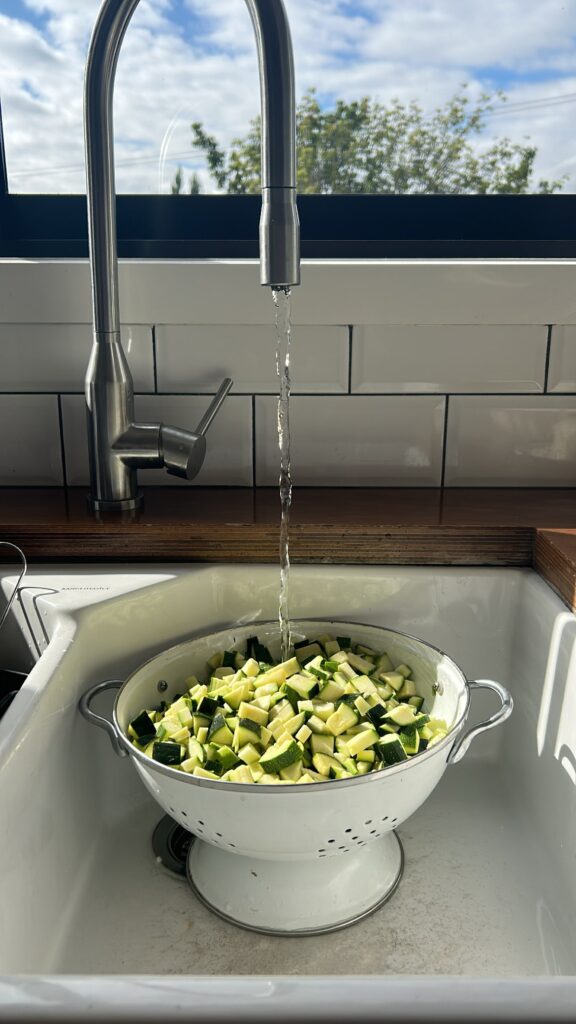 - Clean and prepare 1.5kg of zucchini and cut into little pieces. (I cut mine up like little trivial pursuit pieces for no particular reason except that I liked the look).