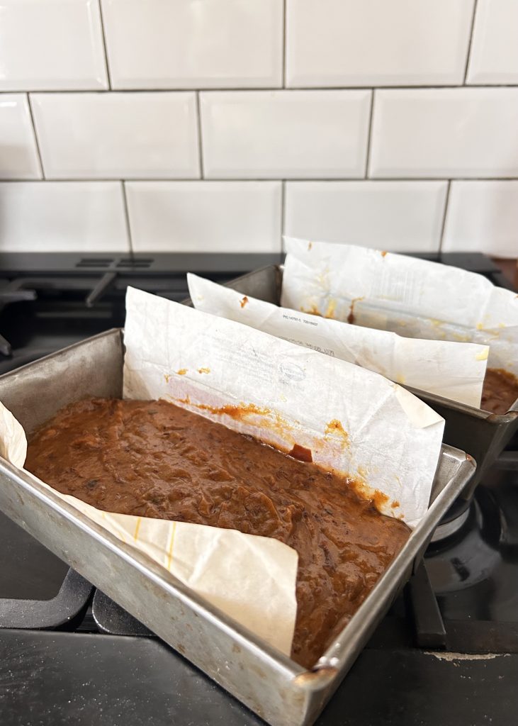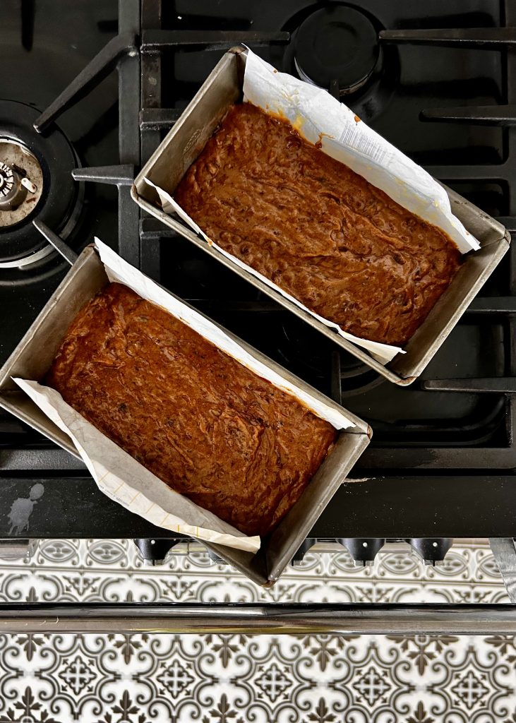 - Pour into your prepared loaf tins, and use a wet hand to smooth down the tops of the loaves.